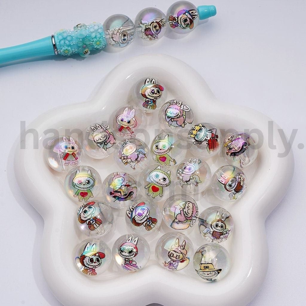 Glossy Large Clear Round with Labub Monster Design 20MM, Random Mix Acrylic Beads