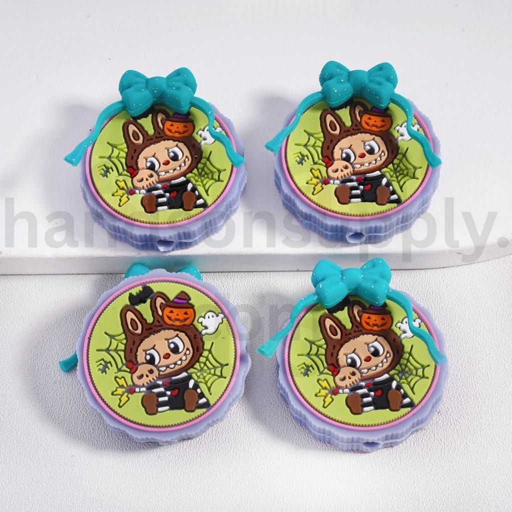 Halloween Labub Ghost Face Pumpkin & Bat with Teal Glitter Bow Round Silicone Focal Bead