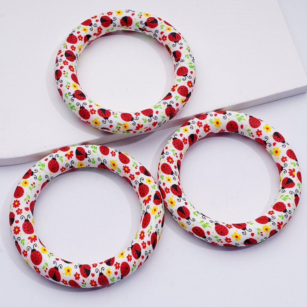 Silicone Ring Bead with Red Ladybug and Floral Print Soft Round Car Hanger Charm Loop, 65MM