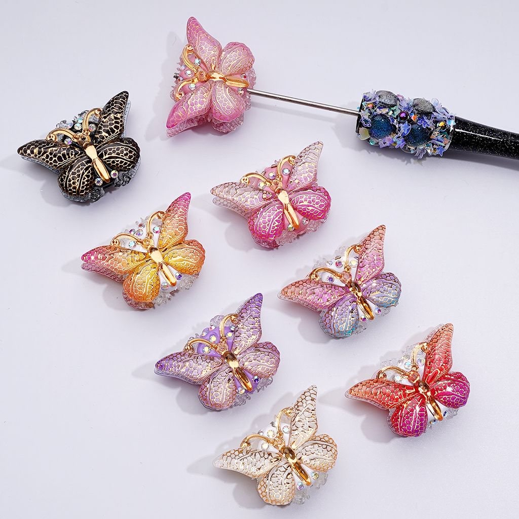 Vivid Butterfly Clay Beads with Gold Stripes, AB Crystals, Mini Floral Accents & Clear Flowers, Approx. 38x23MM