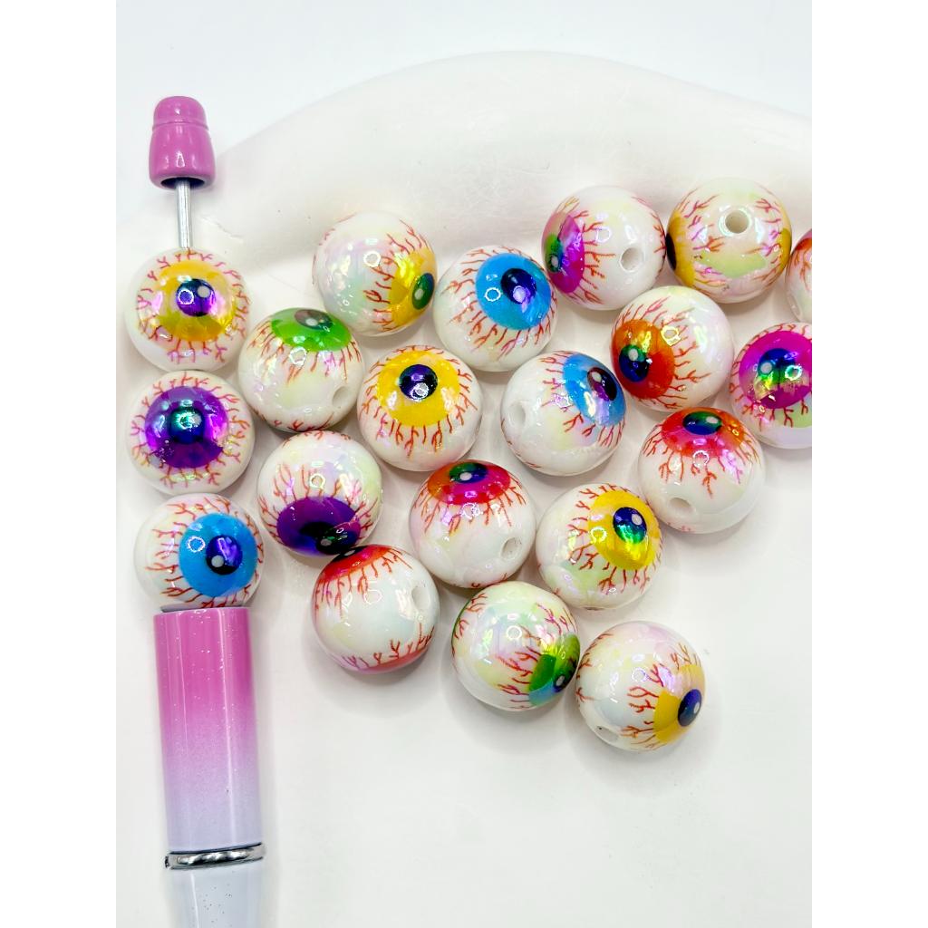 White UV Coating Acrylic Beads with Hallowmas Eyes Prints, Random Mix, 16MM